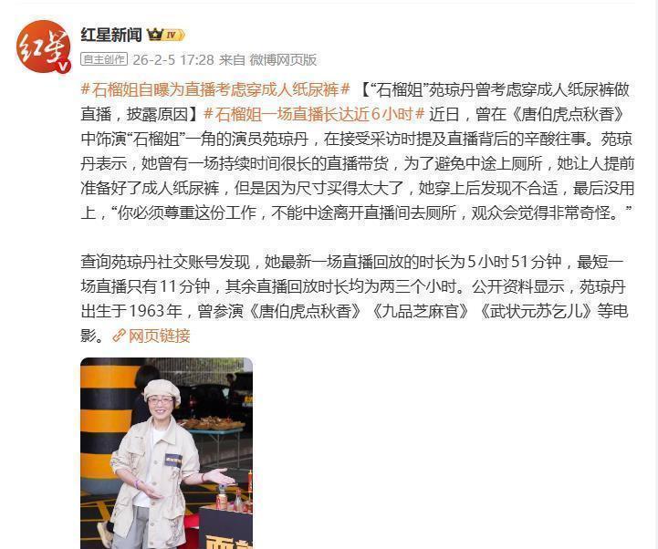 娱乐圈敬业天花板出现了!61岁“石榴姐”苑琼丹一句自曝,直接冲上热搜——为了不中途离开直播间,她竟特意准备了成人纸尿裤!这波操作让网友直呼“离谱又敬佩”,而背后的真相远比想象中更戳心。